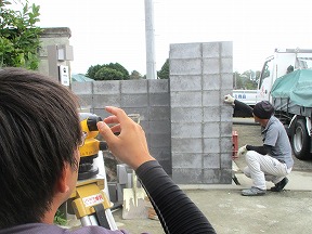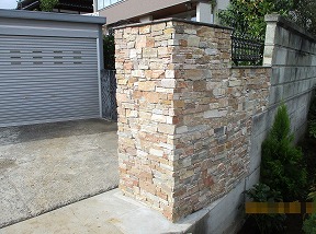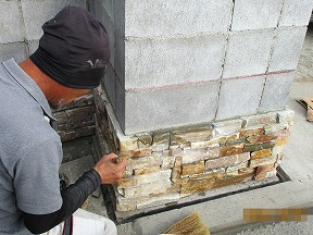 既存の門柱・ブロック塀を解体撤去後、幅15㎝の素地ブロックを積みます。東洋工業の天然石貼材『ロッツプレート(オレンジミックス色)』を積んだブロックに貼っていきます。