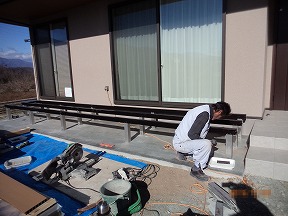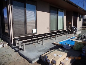 寒冷地仕様で土間コンクリートの厚みは15㎝です。デッキ束柱の高さを住宅に合わせて調整し組み立てます。