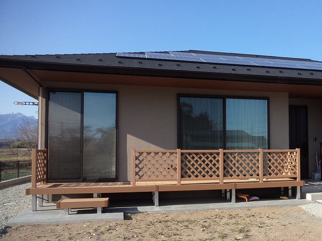 YKKAPのリウッドデッキ200の完成写真です。デッキの大きさは3.5間×4尺です。ラチス格子のフェンスでデッキを囲い、デッキ入口には独立式リウッドステップを設置しました。デッキ材はナチュラルブラウン色です。