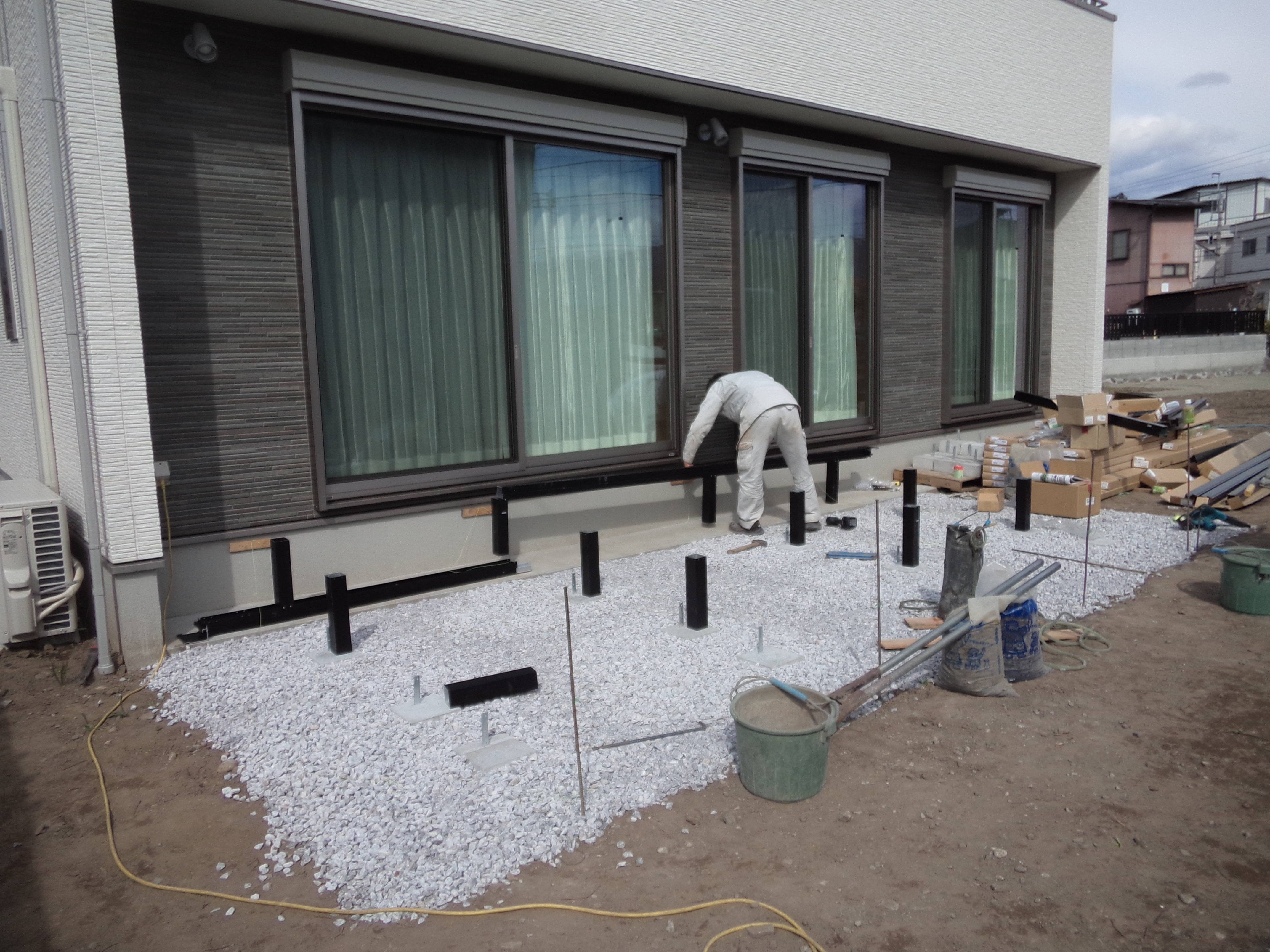 下地には、石灰石を転圧しました。束柱を埋め込んでいます。ベテラン職人が丁寧にしっかり施工していきます。