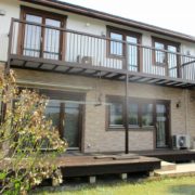 2間×8尺(間口W651×奥行D2420)の大きなデッキですので、いろいろな使い方ができます。デッキはレッドブラウン色、束柱はプラチナステン色です。