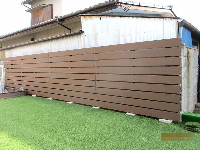 200角の独立基礎を地面に埋め、アルミ柱を建てます。再生木樹脂の板をすき間20㎜空けて9段(H1500)貼り完成です。板はブラウン色、柱はマットブラック色です。