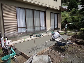 既存の犬走りに追加で土間コンクリート打ちをしました。YKKAPソラリアテラス囲い木調ガーデンタイプ床納まりハイタイプ